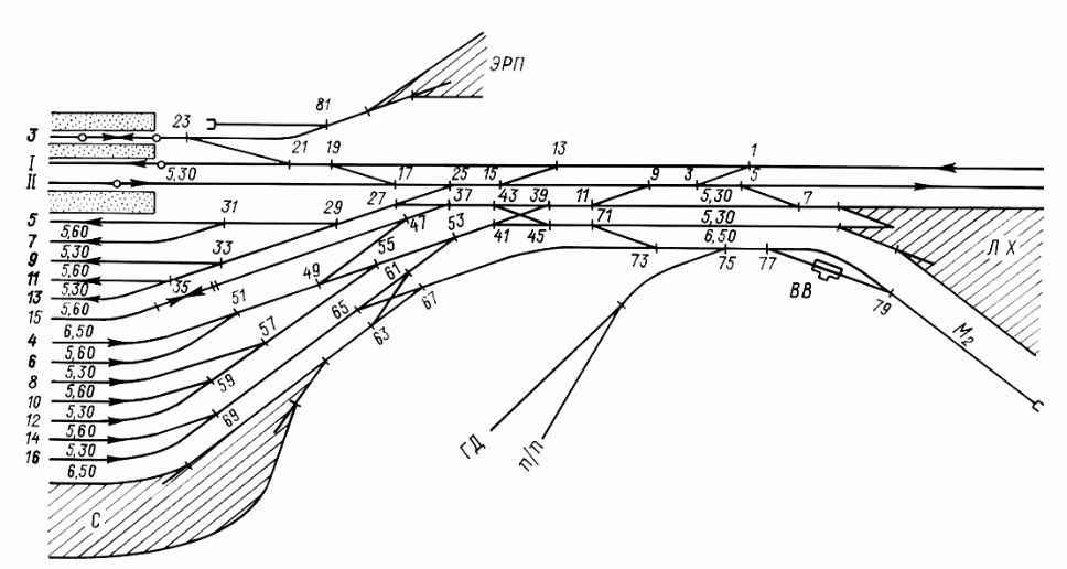 Рис. 6. Схема входной горловины участковой станции поперечного типа двухпутной линии