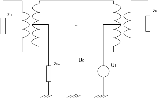 Нагрузки подобраны так, чтобы цепь была согласованной. Если бы линия обладала продольной симметрией, то на нагрузках, включенных слева и справа (zн) напряжение равнялось бы нулю. Реально на zн возникает продольное напряжение в силу продольной асимметрии: