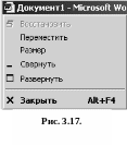 В левом верхнем углу титульной строки программы находится ее пиктограмма. Щелкнув на ней мышкой, откроем меню (рис. 3.17). Оно называется системным, или управляющим.