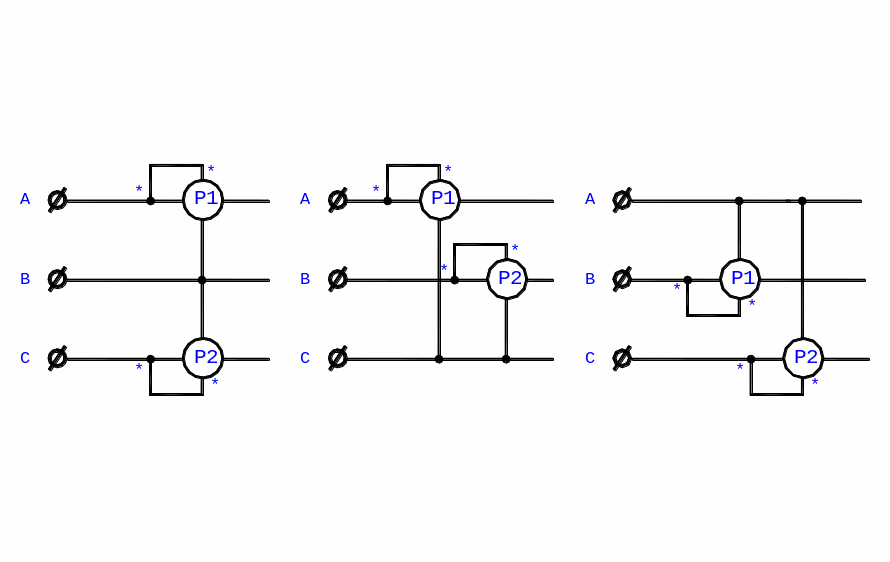 Нольдік сымсыз 3 сымды жүйенің куатын өлшеу келесі схеманың біреуінде көрсетілген.