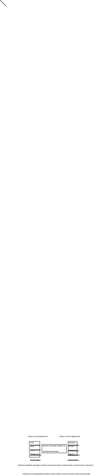 Перша особливість підприємства як системи полягає в тім, що підприємство це відкрита система, яка може існувати лише за умови активної взаємодії з навколишнім середовищем (рис. 1.1). Воно вибирає із проміжного та загального зовнішнього середовища основні фактори виробництва і, перетворюючи їх на продукцію (товари, послуги, інформацію) та відходи, передає знов у зовнішнє середовище. Умовою життєздатності системи є корисний (вигідний) обмін між «входом» і «виходом».