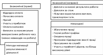 Окрім загальновживаної класифікації методів мотивації (рис. 3.1), їх можна поділити ще й на індивідуальні та групові, а також на зовнішні — винагороди, що надходять із зовні, та внутрішні — винагороди, що надаються самою працею (почуття значущості праці, самоповаги та ін.) [17].