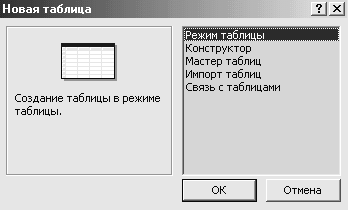 Для создания новой таблицы в окне базы данных требуется выбрать раздел «Таблицы» и нажать кнопку «Создать». При этом откроется окно диалога «Новая таблица» (рис.3), в котором из списка выбирается один из режимов создания таблицы, описанных ниже: