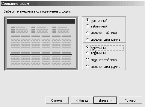 Третий шаг посвящен выбору внешнего вида подчиненной формы (рис.16). Для каждой подчиненной формы можно выбрать свой вид представления данных. Чаще всего используется вид «ленточный».