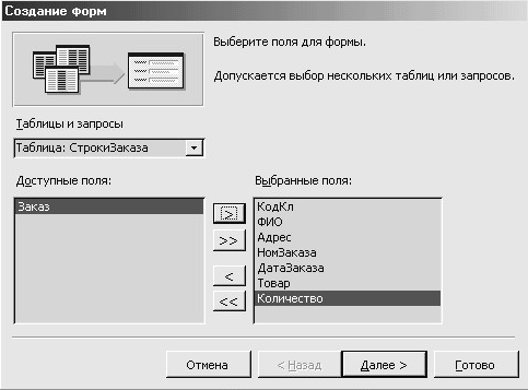 Форму удобнее создавать при помощи мастера. На первом шаге необходимо выбрать поля для формы (рис.14). Поля можно выбирать из нескольких таблиц и запросов, связанных между собой в схеме данных. Из таблицы «Список клиентов» берутся поля «КодКл», «ФИО», «Адрес», из таблицы «Заказы» - поля «НомЗаказа» и «ДатаЗаказа», из таблицы «Строки заказа» - поля «Товар» и «Количество».