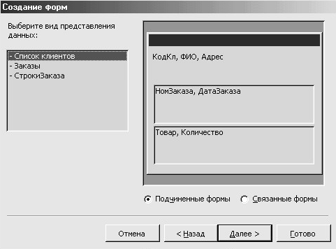 На втором шаге требуется указать вид представления данных. Здесь можно создать одиночную форму, подчиненные формы или связанные формы (рис.15).