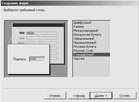 На четвертом шаге следует указать стиль оформления основной формы (рис.17). Под стилем понимается фоновый рисунок для формы, формат шрифтов и цветовая гамма.