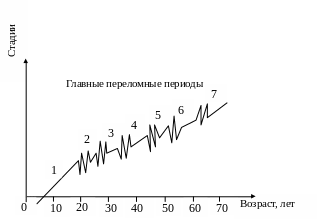 3 – достижение успеха; 4 – профессионализм; 5 – переоценка ценностей; 6 – мастерство; 7 – пенсионный период)