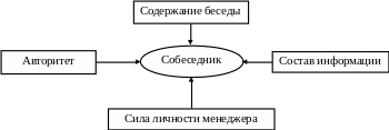 Процесс непосредственного общения. Оно начинается с создания контакта. Эта фаза связана с преодолением определенного психологического барьера. Некоторым лицам этот барьер кажется таким непреодолимым, что они отказываются вообще обращаться к кому бы то ни было. Чтобы такого не происходило, менеджер должен знать, что любой собеседник подвергается воздействию со стороны авторитета инициатора беседы; содержания беседы; достаточности (недостаточности) информации по обсуждаемой теме; силы личности (рис. 6.25). В процессе общения судьба беседы зависит буквально от первых минут. В эти минуты нужно установить контакт, создать психологический комфорт, настроить интеллект беседующих в унисон. Для этого опытные специалисты рекомендуют готовить свой первый вопрос так, чтобы он был коротким, интересным, но не дискуссионным. Такой вопрос и его энергичное разрешение определяют положительный эмоциональный тонус собеседников и чувство результативности.