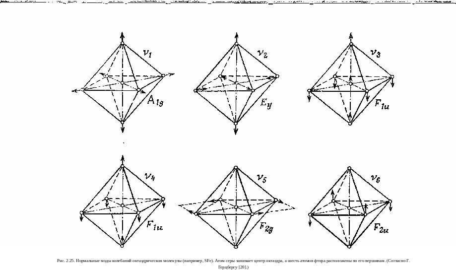 атом серы располагается в центре октаэдра, а шесть атомов фтора находятся в ее углах. Если теперь выбрать симметричную колебательную моду, показанную на том же рисунке (мода A\g), то увидим, что за координату i? может быть принято расстояние между атомом серы и каждым из атомов фтора. В действительности такая молекула, как SF6 (рис, 2.25), обладает шестью независимыми, невырожденными колебательными модами. Потенциальная энергия U общего состояния молекулы