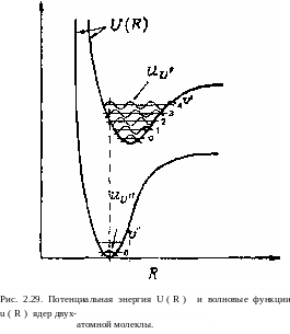 Третий сомножитель в правой части этого выражения снова приводит к правилу отбора AJ = ±1. Если первый сомножитель в (2.187) равен нулю благодаря свойствам симметрии электронных волновых функций, то такой вибронный переход называется электродипольно запрещенным. Для разрешенного перехода величина |fi)2, а следовательно, и вероятность перехода W в данное колебательное состояние оказываются пропорциональными второму сомножителю в выражении (2.187), известному как множитель Франка — Коидона. Заметим, что в рассматриваемом случае этот множитель отличен от нуля, поскольку u2v и u\v принадлежат различным электронным состояниям. Таким образом, вероятность перехода W определяется степенью перекрытия волновых функций ядер. Рассмотрим случай, представленный на рис. 2.29, где колебательные уровни основного и возбужденного электронных состояний обозначены соответственно символами v" и v'9 и предположим, что молекула первоначально находится на основном колебательном уровне v" = 0. При этом видно, что наибольшей является вероятность перехода в возбужденное состояние с vf= 4, для которого мы имеем максимальное перекрытие между волновыми функциями ядер uv» и uv<. Таким образом, принцип Франка - Кондона, который мы ввели выше для качественного рассмотрения, представлен теперь в более точной и количественной форме.