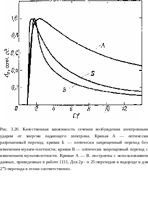 ности максимальное се- чение резко падает почти на три порядка (до значения около Ю-19 см2), а ширина кривой может быть всего в 3—4 раза боль- ше пороговой энергии (кривая Б на рис. 3.20). 3) В случае когда происходит измене- ние мультиплетности, максимальное сечение может быть боль- ше, чем для оптически запрещенного перехода, а ширина кри- вой теперь, как правило, равна или несколько меньше порого- вой энергии £ПОр (кривая В на рис 3.20). Следует заметить, что во трех случаях ширина кривой сравнима с пороговой