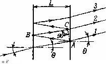 Если рассматривать только те пучки, направления распространения которых лежат в плоскости рис. 4.15, а, то для каждого угла 9л в фокальной плоскости будут наблюдаться две яркие точки Р и Р'. Рассмотрим теперь весь набор падающих лучей, а не только те, что в плоскости рисунка. Мы видим, что прошедший свет, соответствующий углу 6„, образует в фокальной плоскости яркую окружность радиусом