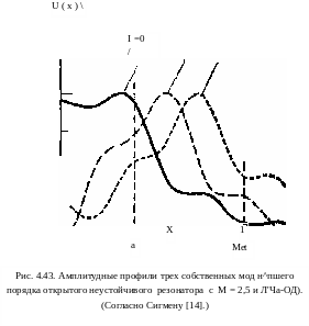 пересекающихся мод становятся одинаковыми. Если обратиться, например, к рис. 4.43, то происходящее можно описать следующим образом. Когда ЛГэкв изменяется от 0,6 до приблизительно 1, распределение интенсивности моды / = 0 расширяется в сторону больших значений х, в то время как распределение моды / = 1 стягивается вовнутрь, так что при Мжв ~ 1 оба распределения становятся одинаковыми. Следовательно, в этой точке значительная разница в потерях существует между модой 1=2 и модами I - О, I = 1 (с точки зрения дифракционных свойств эти моды можно рассматривать по существу как одну и ту же моду 1)). В заключение можно сказать, что неустойчивые резонаторы в любом случае обеспечивают хорошую селекцию поперечных мод, особенно при полуцелых значениях N