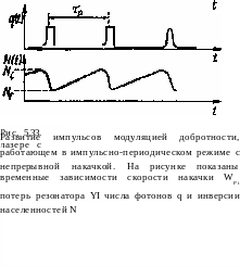 Время задержки между максимумом импульса !) и моментом включения добротности резонатора id (см. рис. 5.32) можно считать приближенно равным времени, которое необходимо для того, чтобы число фотонов достигло определенной величины относительно максимального числа фотонов. Если выбрать, например, эту долю равной 1/10, то до этого момента времени не произойдет сколько-нибудь заметного насыщения инверсии и в уравнении (5.886) можно воспользоваться приближением M(t) = Ni. Тогда это уравнение с учетом соотношений (5.89) и (5.90) принимает вид q = (х — \)q/xc, и после интегрирования мы имеем