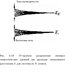 jV-кратно вырожденное состояние с энергией Е\ расщепляется на /V близко расположенных уровней. Следовательно, состояние с энергией Е\ приводит к валентной зоне, в то время как со- стояние с энергией Н2 приводит таким же образом к зоне прово- димости (рис. 6.39). Из предыдущих рассуждений следует, что каждая зона на самом деле состоит из N близко расположен- ных уровней, где N — полное число атомов в кристалле полу- проводника. Поскольку N, d как правило, очень велико»