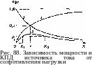 Любую полезную мощность Pv меньшую максимальной, можно получить, как свидетельствует ход кривой 2 на рис.88, при двух значениях Rx и R2 сопротивления нагрузки. Практически для получения заданной полезной мощности следует выбирать нагрузку с большим сопротивлением R2, так как КПД при этом выше. Для получения КПД, близкого к единице, следует брать нагрузку с сопротивлением, много большим внутреннего сопротивления источника тока, но при этом выделяющаяся мощность Рп—*0.