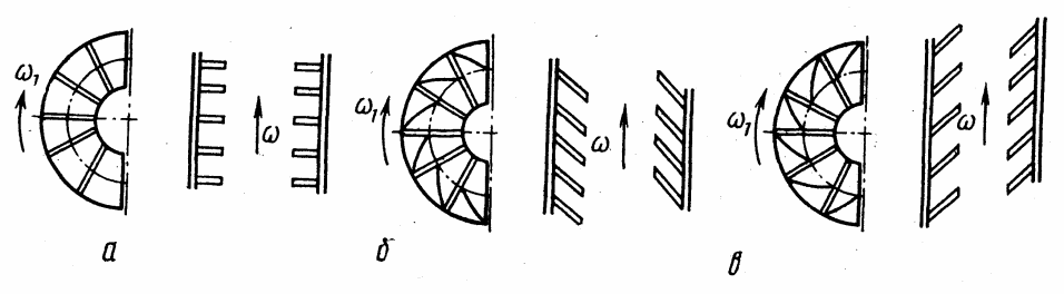Гідромуфти забезпечені радіальними лопатками (рис. 2.2, а), нахиленими назад (рис. 2.2, б), і лопатками, нахиленими вперед (рис. 1.2, в). Нахил лопаток має кут 45° до площини меридіонального перетину. При ковзанні S=3% гідромуфта з лопатками, нахиленими вперед під кутом 45°, передає момент в 2,5 рази більший, ніж гідромуфта з радіальними лопатками, а гідромуфта з лопатками, нахиленими назад, передає момент на 5% менший, ніж гідромуфта з радіальними лопатками.