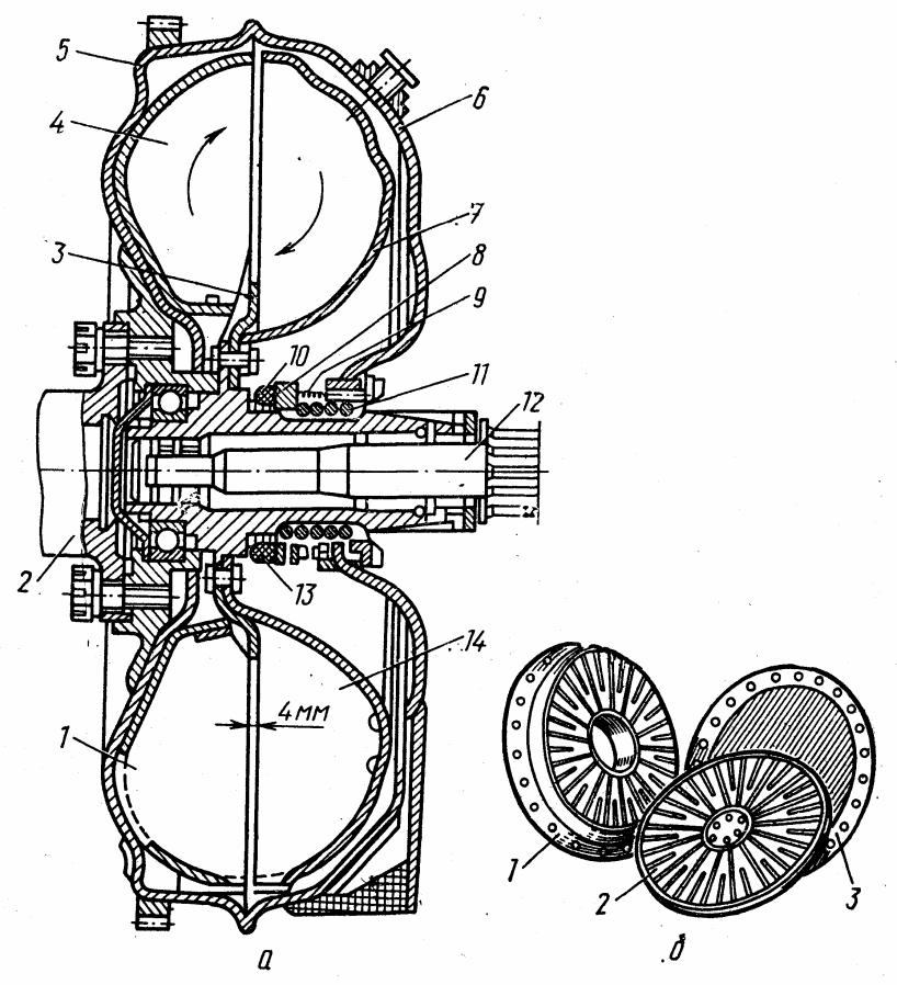 Гідромуфта (рис. 2.1, а) має насосне колесо 1, 4 турбінне колесо 7, 14, вал насосного колеса 2, вал 12 турбінного колеса, діафрагмовими поріг 3, корпус 5 і 6.
