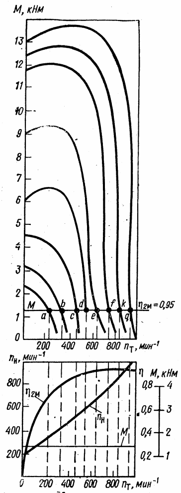 Крім того, універсальна характеристика дає криві залежностей крутних моментів гідромуфти при однакових значеннях ККД, тобто Мк=f(nнnт) при η=const для ряду значень η=0,1; 0,2; 0,3 і т. д.