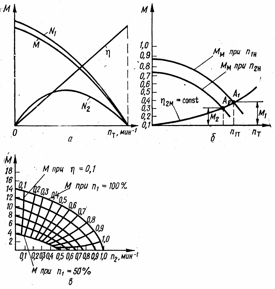 Зовнішню характеристику гідромуфти (рис. 2.10, а) будують таким чином. На осі абсцис відкладають частоту обертання турбінного колеса nт, або відносну частоту обертання турбіни і=nт/nн, а на осі ординат відкладають зміна обертального моменту, значення ККД і потужності.