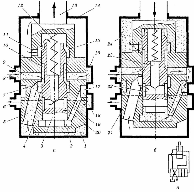 а і б – в нижньому і верхньому положеннях; в – умовне позначення на принципових схемах; 1 і 24 – нижня і верхня порожнини корпусу; 2, 7 і 15 – внутрішні кільцеві виточки поршня; 3 – золотник; 4 – поршень; 5 і 19 – косі отвори; 6 і 8 – отвори, відповідно для зливання і підведення оливи; 9 і 21 – наскрізні радіальні отвори поршня; 10 і 20 – кільцеві виточки золотиика; 11 – радіальний отвір поршня; 12 – пружина; 13 – шток; 14 – корпус; 16 і 18 – кільцеві виточки корпусу; 17 – зовнішня кільцева виточка поршня; 22 – радіальний отвір золотника; 23 – осьовий канал золотника