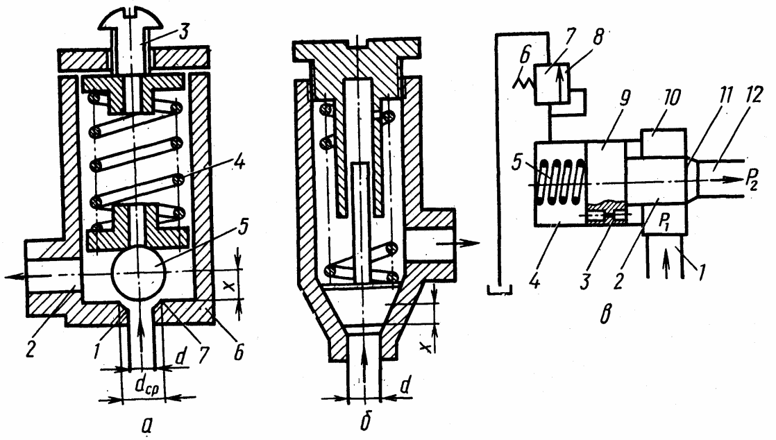 Принципова схема пристрою кулькового і конічного напірних гідроклапанів наведена на рис. 4.8, а і б.