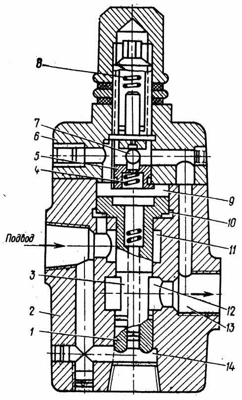 На кульку 7 діють з одного боку тиск, що знаходиться в порожнині 9, з іншого – зусилля пружини 8. Якщо тиск в порожнині 9 більше, ніж зусилля, на яке настроєна пружина, то кулька підніметься догори від сідла 5 і рідина з порожнини 9 через клапан і отвори в кришці 6 і корпусі 2 піде в порожнину зливу 13 і в бак. Пружину 8 називають регулювальної, так як при її допомозі налаштовується гідроклапан з переливним золотником на необхідний тиск. Порожнина 9 поповнюється рідиною з порожнини 14 через демпфер 1, в зв’язку з чим створюється перепад тиску між порожнинами 9 і 14. З підвищенням тиску в порожнині 11 збільшуються сили, що діють на золотник знизу вгору, тому золотник підводиться і з’єднує порожнини 11 і 14, а це зменшує тиск в порожнині 11, на якe настроєна пружина 8. Отже, при русі рідини з порожнини 11 в порожнину 14 створюється постійний тиск.