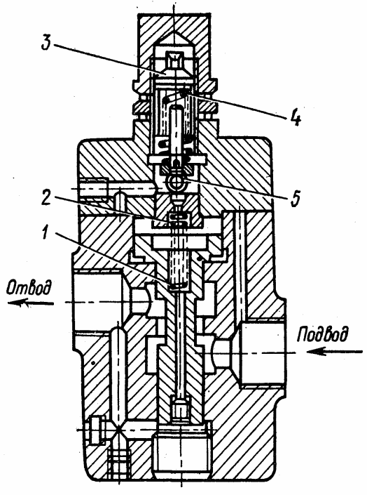 Гідроклапан має золотник 1 ступінчастою форми, нерегульовану пружину 2, допоміжний запірний елемент (кулька) 5, пружину 4, регулювальний гвинт 3.