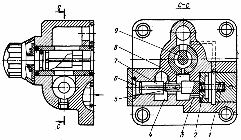 Однак при збільшенні тиску перед дроселем прохідний перетин між порожнинами 4 і 8 зменшується, а отже, тиск збільшується, таким чином в порожнині 8 підтримуватиметься постійне значення тиску: