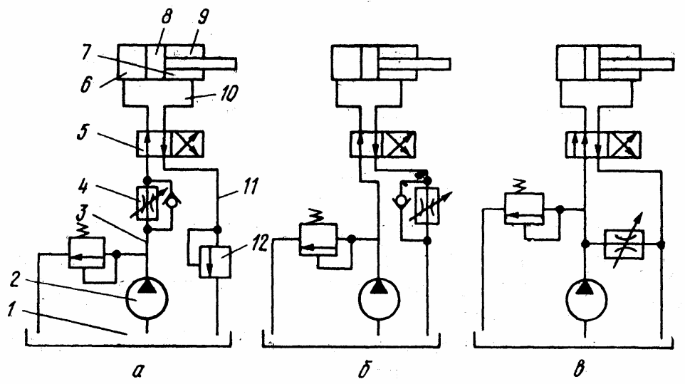 Рідина з гідробака 1 (рис. 4.16, а) нерегульованим насосом 2 подається під тиском по напірному трубопроводу 3 через дросель 4 в гідророзподільник 5 і поршневу порожнину 6 гідродвигуна 7. Під тиском рідині поршень переміщається вправо і витісняє рідину з штокової порожнини 9 в зливну лінію 10 в гідророзподілювач 5 в зливну лінію 11 через напірний гідроклапан 12 в гідробак. При повністю відкритому дроселі 4 швидкість поршня 8 буде максимальною.