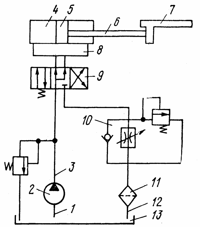 Насос 2, що приводиться в рух двигуном, подає рідину з гідробака 13 по всмоктуючій 1 і нагнітальній 3 гідролініям через золотниковий гідророзподільник 9 в ліву поршневу порожнину гідродвигуна 4. Рідина, що рухається під тиском, діє на поршень 5, внаслідок чого останній рухається вправо. Рідина, що знаходиться в штоковій порожнині, буде витіснена поршнем в трубопровід 8 і далі в золотниковий гідророзподільник 9, дросель з регулятором 10, фільтр 11, зливну гідролінію 12 і в гідробак.