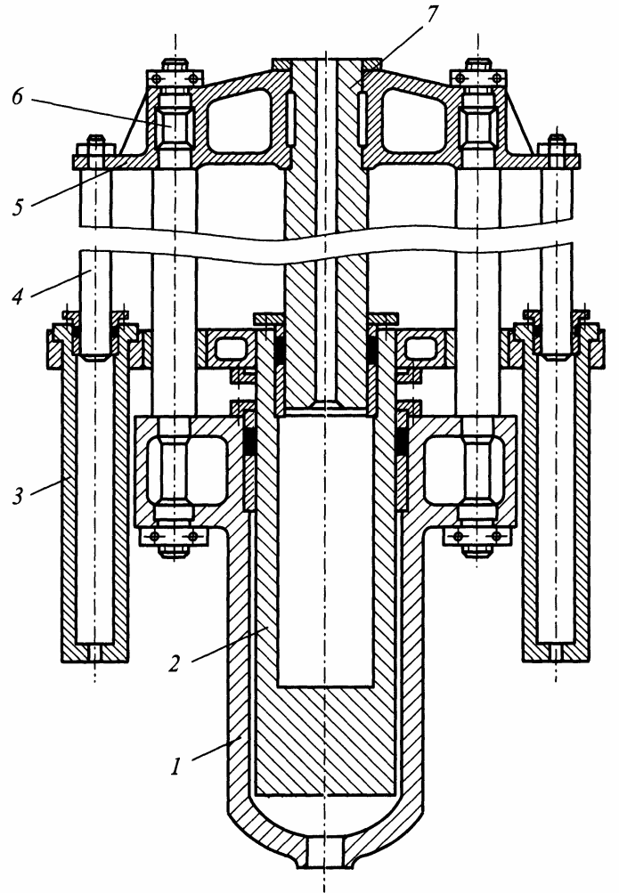 Для здійснення зворотного ходу циліндра-плунжера 2 використовують циліндри поворотного ходу 3 з плунжерами 4, укріпленими на нерухомій верхній поперечині 5, яка з’єднана з циліндром низького тиску 1 за допомогою колон 6.