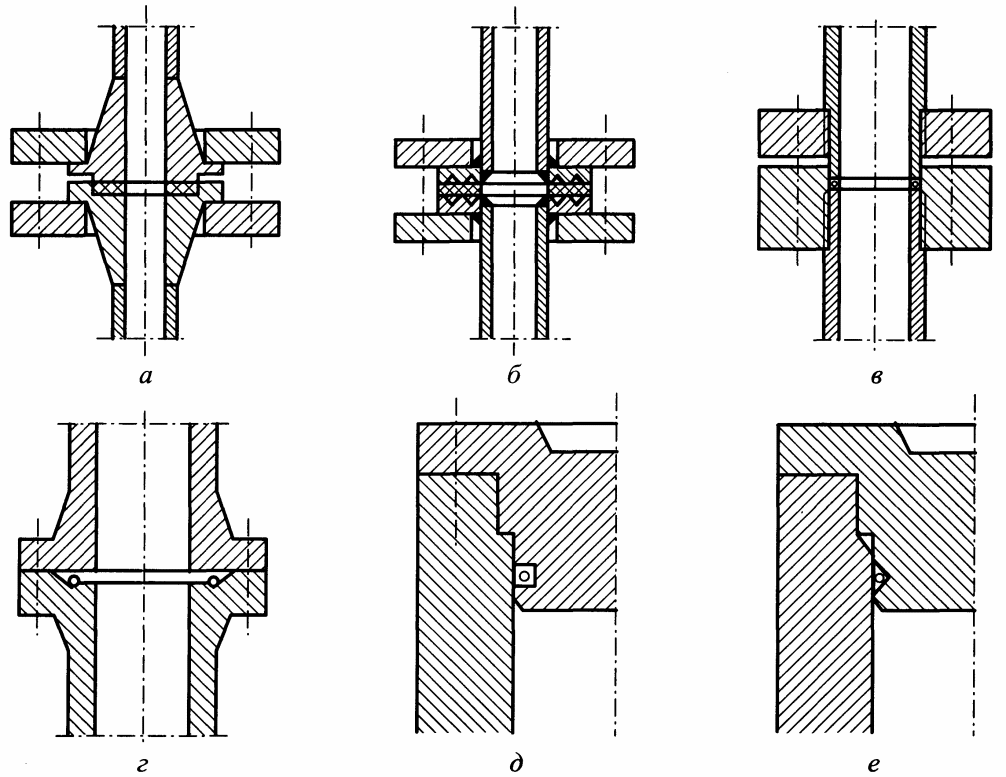 Рисунок 6.21 – Конструктивні схеми затягуваних (а-г) і самоущільнюючих (д, е) з’єднань