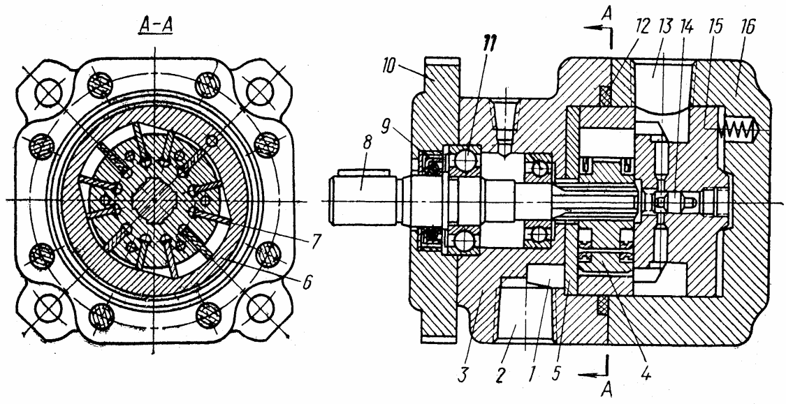 Гідромотор типу МГ16-1 (рис. 4.6) працює таким чином. Рідина під тиском подається в отвір 2, потім через кільцевий канал 1 корпусу 3 і далі через вікна переднього диска 5 потрапляє на пластинки 7 ротора 4, заставляючи ротор обертатися проти годинникової стрілки. Відводиться рідина через вікно заднього диска 15 і отвори 13, 14 в кришці 16 корпуса 3. Вал гідромотора 8 обертається в двох кулькових підшипниках 11. На валу на шліцах закріплений ротор 4, в пази якого вставлені пластинки 7, притискаються при обертанні ротора силою інерції до внутрішньої поверхні статора 6. Крім того, ці пластинки притискаються до статора коромислоподібними пружинами; одна пружина притискує дві пластинки, розташовані один до одного під кутом 90°; наскільки одна пластинка при обертанні ротора вийде з паза ротора, настільки друга увійде до паза. Таким чином, пружина не деформується, що збільшує її довговічність.