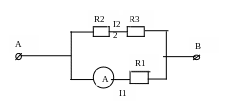 55. Найдите распределение токов и напряжения на отдельных участках цепи, изображенной на рисунке, если амперметр показывает 0,4 А, а сопротивления резисторов R1=40 кОм, R2=15 кОм, R3=25 кОм.