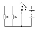60. Каковы будут показания амперметра, если переключатель поочередно поставить в положение А, В, C? ЭДС батареи равна 10В, а ее внутреннее сопротивление 0,8 Ом; сопротивление резисторов R1=R2=18,4 Ом.