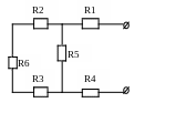 61. Определите общее сопротивление цепи, изображенной на рисунке, где сопротивления резисторов R1=R2=R3=R4=1 кОм, а R5=R6=2 кОм.