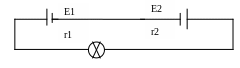 66. Гальванические элементы с ЭДС 4,50 и 1,50 В и внутренними сопротивлениями 1,50 и 0,50 Ом, соединенные, как показано на рисунке, питают лампу от карманного фонаря. Какую мощность потребляет лампа, если известно, что сопротивление ее нити в нагретом состоянии равно 23 Ом? (см. рис).