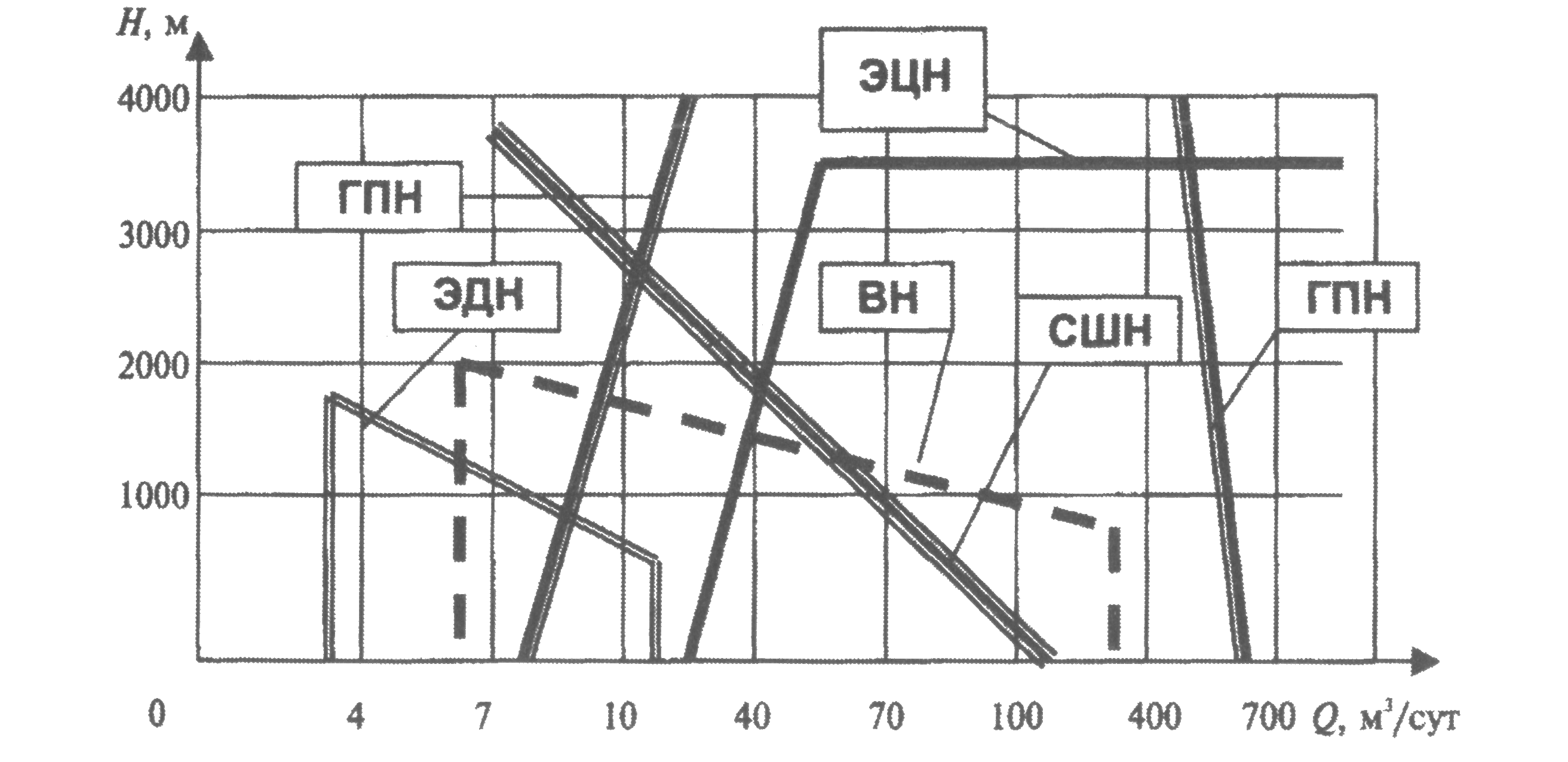 Рис. 5.1. Области применения скважинных насосных установок для добычи нефти