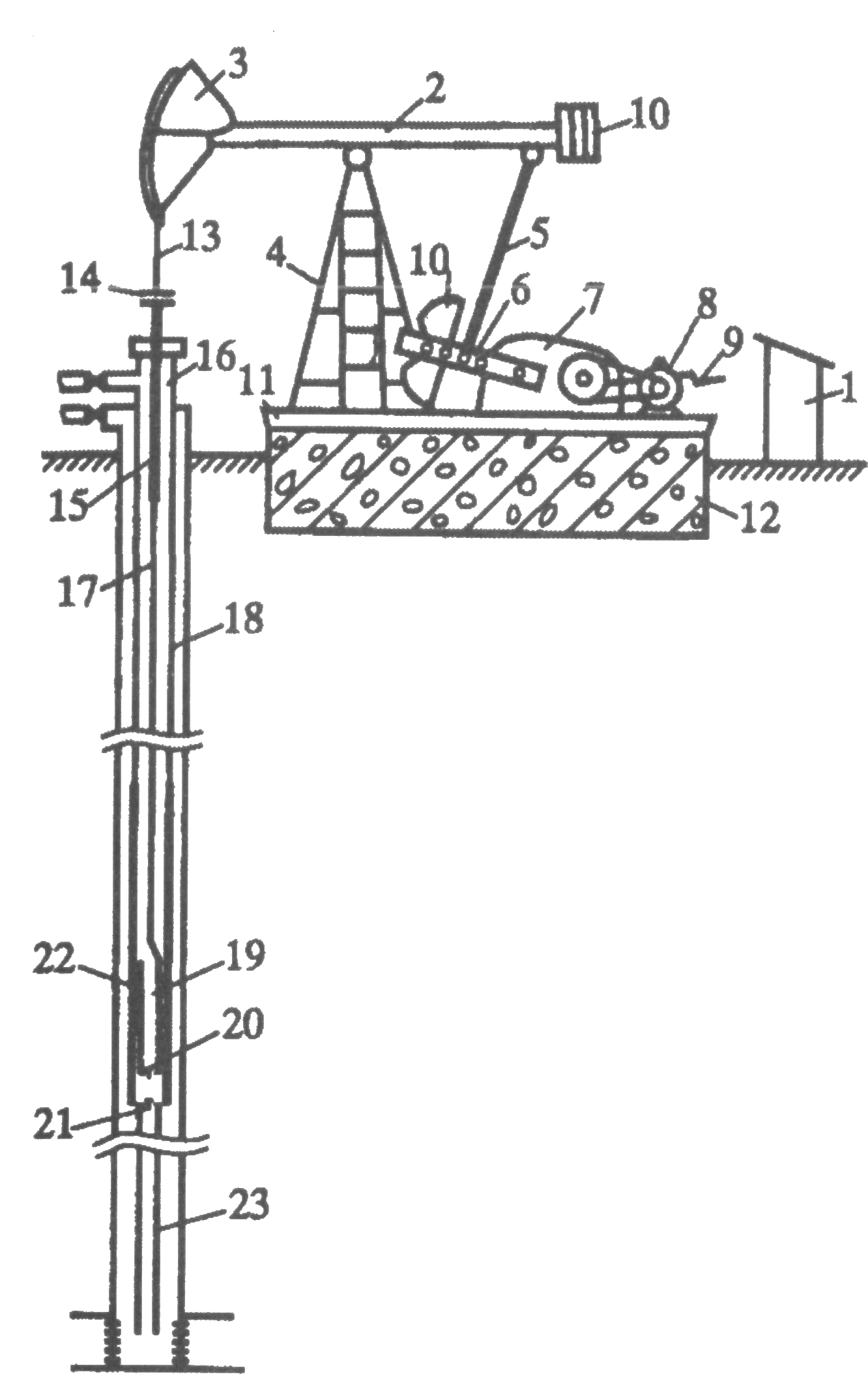 Подземное оборудование включает колонну штанг 17, предназначенную для передачи возвратно-поступательного движения головки балансира плунжеру 19 глубинного насоса, а также для восприятия нагрузок, действующих на штанги в течение насосного цикла. Имеется колонна НКТ 18, на нижнем конце которой закреплен цилиндр насоса 22. Плунжер глубинного насоса имеет один или два нагнетательных клапана 20, а цилиндр насоса — всасывающий клапан 2. К приему насоса закреплен хвостовик 23.