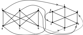 Решение. Заданные графы изоморфны. Один из возможных в данном случае изоморфизмов задан нумерацией вершин и для наглядности показан стрелками.