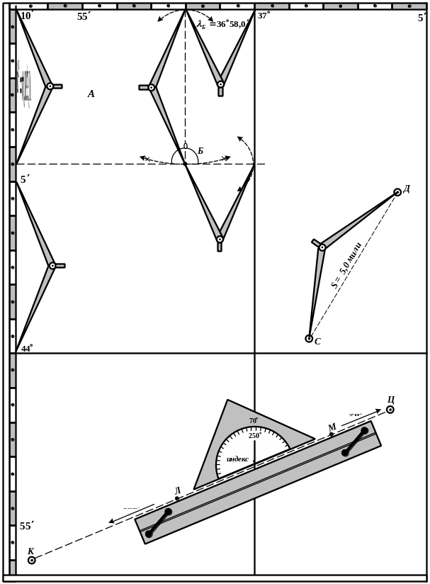 На боковой рамке карты карандашом отмчается заданная широта φ (рис.6). Приложив параллельную линейку к параллели, ближайшей к заданной широте, передвигают одну из половинок линейки к заданной широте на горизонтальной рамке отмечается заданная долгота λ и циркулем измеряется расстояние от заданной долготы до ближайшего меридиана. Поставив ножку циркуля на тот же меридиан у среза линейки, другой ножкой делают укол у того же среза линейки. Место укола и будет искомой точкой.