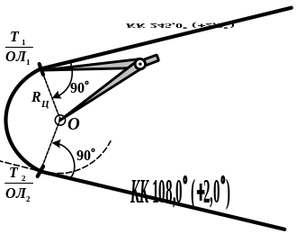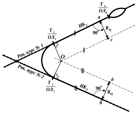 внутри получившегося угла параллельно линиям истинных курсов проводят отрезки прямых на дистанции равной радиусу циркуляции, до их пересечения, точка О;