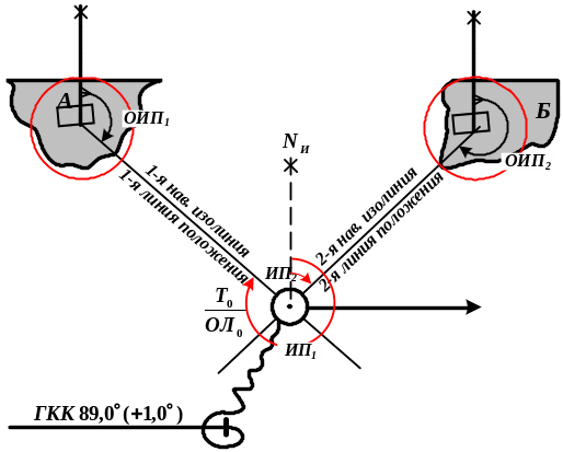 от ориентира откладываются обратные истинные пеленга ОИП1 и ОИП2;
