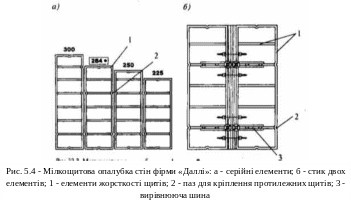 Мілкощитова опалубка фірми «Далли» складається із щитів висотою 2.64, 1.32 та 0.88 м і 10 типорозмірів за шириною від 0.75 до 0.20 через кожні 5 см. На торцях кожного щиту передбачені дві приварені шестигранні гайки, що забезпечують міцне штирове з'єднання двох щитів. (рис. 5.4).