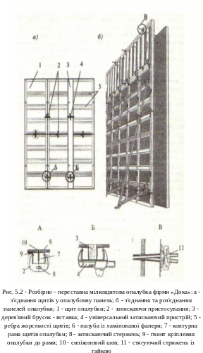Рис. 5.5 - Опалубка коло фірми «Далі»: а - опалубка із кріпленням з тягувальними стрижнями; б - те ж, із зовнішніми кутовими елементами