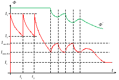 В исходном положении обмотка возбуждения LМ обтекается максимальным током, и двигатель имеет номинальный магнитный поток Фн. Пуск двигателя может осуществляться по любому принципу, при этом пока двигатель не вышел на естественную характеристику контакты последней ступени контактора ускорения шунтирующей добавочное сопротивление в цепи обмотки возбуждения замкнуты, поэтому разгон до основной скорости производится с постоянным магнитным потоком, при этом контакты токового реле включенные параллельно добавочному сопротивлению замкнуты. По мере разгона на естественной характеристике ток в цепи якоря уменьшается и при достижении величины тока отпускания контактов реле КА размыкает свои контакты и в цепь обмотки возбуждения вводится добавочное сопротивление, при этом поток снижается, а ток в цепи якоря вырастает. Контакты токового реле КА замыкаются и в цепи обмотки возбуждения шунтируется добавочное сопротивление. Магнитный токо несколько возрастает и ток в цепи якоря уменьшается, и так до тех пор пока ток в цепи якоря не станет равным току нагрузки. Этот принцип разгона называется вибрационным.