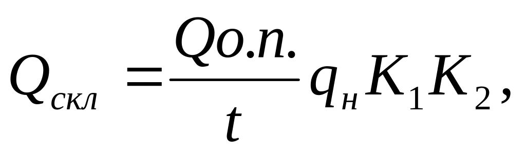 где, Qо.п. – объем общей потребности в строительных материалах, конструкциях и деталях для выполнения строительно-монтажных работ за время t; qн – норма запаса; К1 – коэффициент неравномерности поступления материалов, конструкций и изделий на строительные площадки, принимаемый равным 1,1…1,2 при доставке материалов автотранспортом и 1,3…1,5 – при доставке их железнодорожным транспортом; К2 - коэффициент неравномерности потребления материалов, принимаемый равным 1,3…1,5.