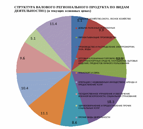 В структуре валового регионального продукта в 2009 г. основными видами экономической деятельности являлись: производство и распределение электроэнергии, газа и воды – 16,3%; обрабатывающие производства – 12,5, транспорт и связь – 11,1; оптовая и розничная торговля; ремонт автотранспортных средств, мотоциклов, бытовых изделий и предметов личного пользования – 8,6%.